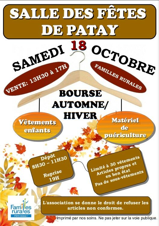 Familles Rurales organise une bourse aux vêtements enfants printemps/été et articles de puériculture le samedi octobre, à la salle des fêtes de Patay.