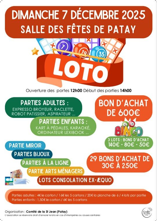 Le dimanche 7 décembre, le Comité de la Saint Jean organise, à la salle des fêtes de Patay, son loto.