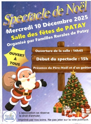 Le mercredi 10 décembre, l’association Familles Rurales vous donne rendez- vous à la salle des fêtes de Patay, à partir de 14h45 pour un spectacle de Noël qui débutera à 15h.